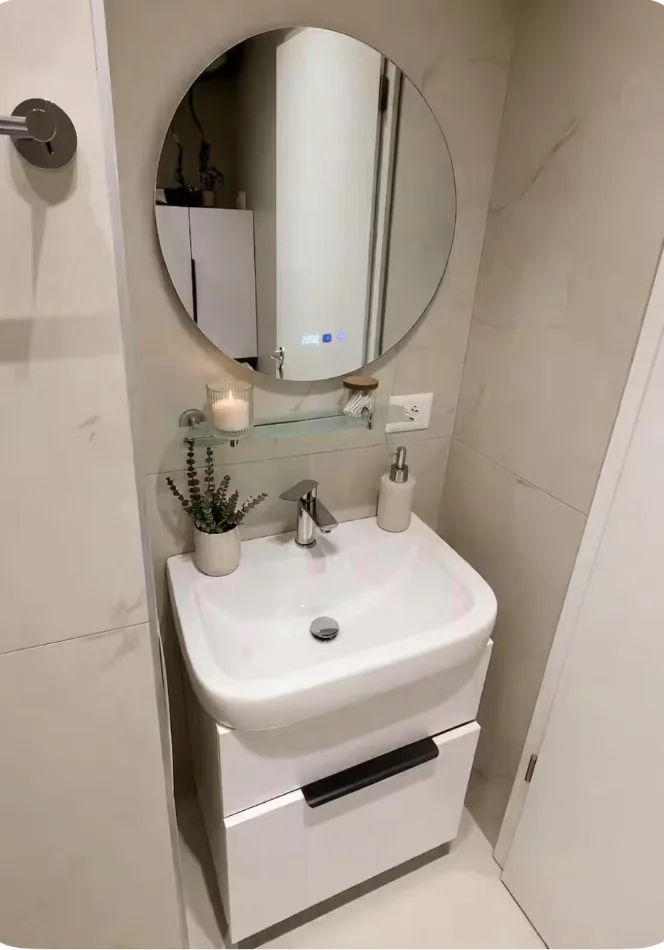 - banjo e vogël por e kompletuar më së miri: kabinë dushi, rafte të bollshme poshtë lavamanit dhe sipër lavatriçes; pasqyrë me LED; lavatrice smart 8kg