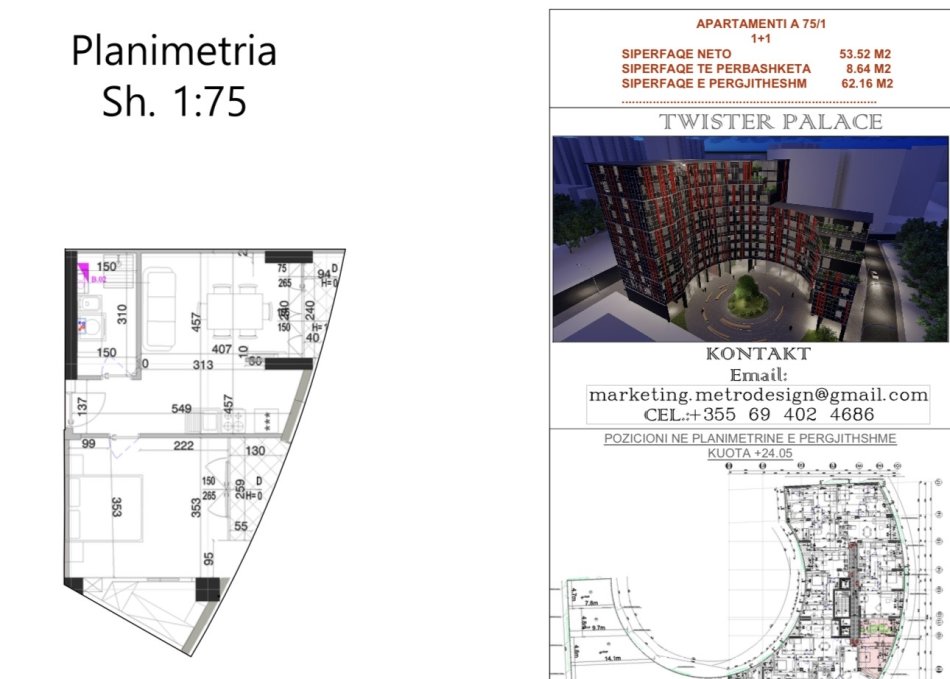 Kompleksi Twister. Apartament + parkim. Planimetri e rregullt katrore. Ne mbarim. Organizuar me Arkitekt. 150.000 €