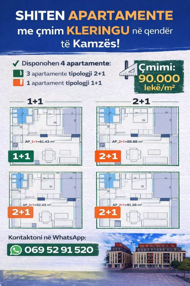 Shiten 4 apartamente në Qender Kamez.Apartamentet janë kleringu.Shiten veç e veç.Mundesi e mirë zgjedhje,per banim ose investim.Siperfaqet e apartamenteve në foto janë netFROHEN APARTAMENTE KLERINGU PËR ÇMIME TË FAVORSHME!ÇMIMET JANË ME 900 MIJË/M2.Mos hezitoni të na kontaktoni!Për më tepër informacion,kontaktoni te numri 00355695291520